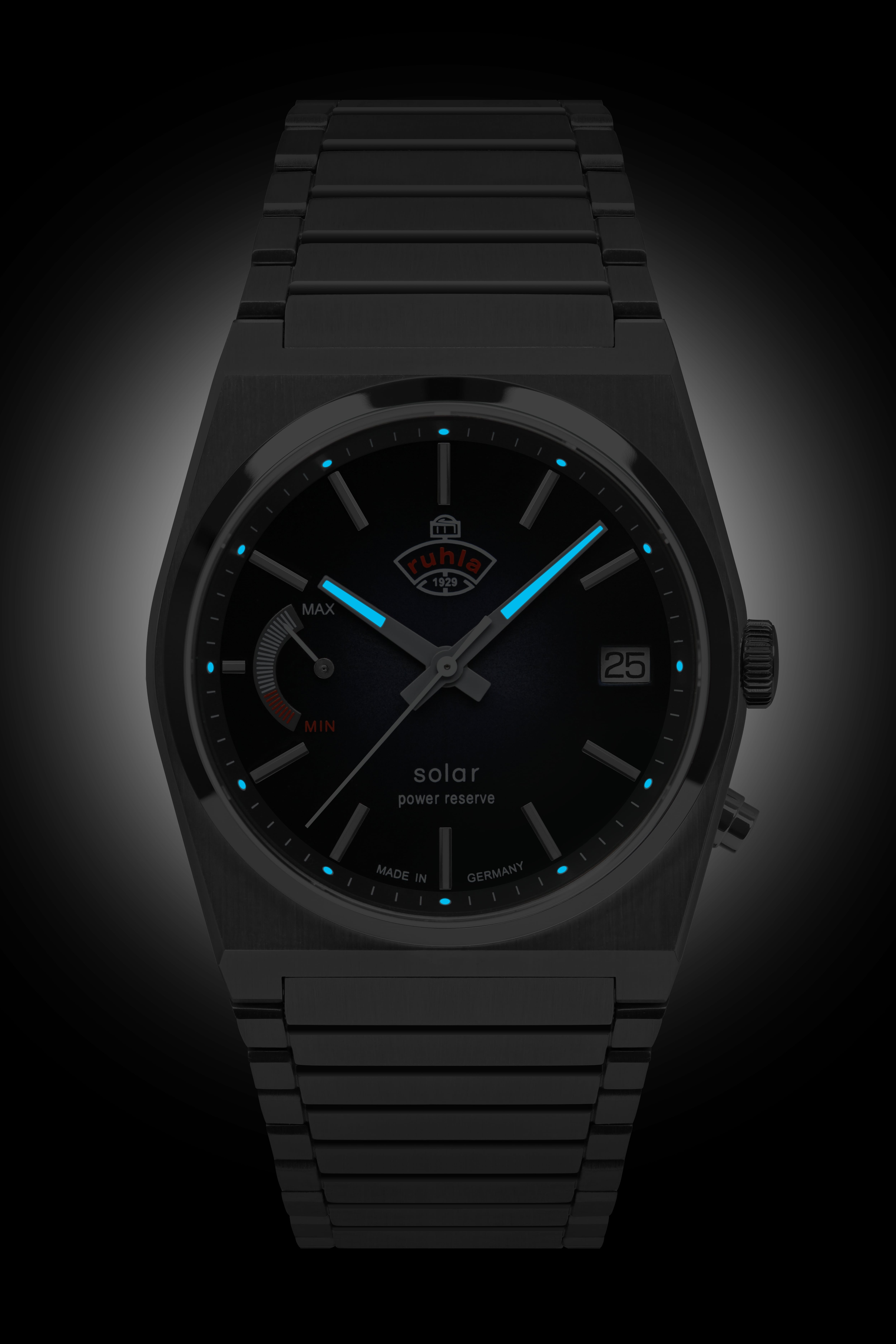 パワーリザーブ表示 ダークブルーダイヤル、夜光針