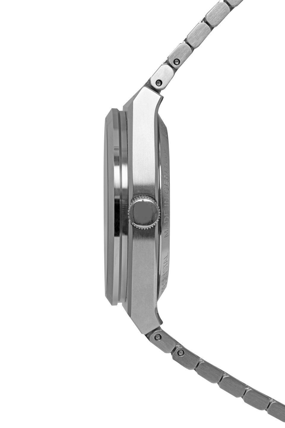 ・Classic, analogue wristwatch in stainless steel case with integrated metal strap