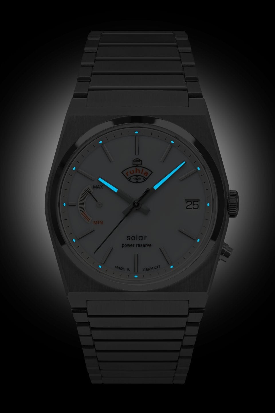 ・White dial with silver indices, luminous hands